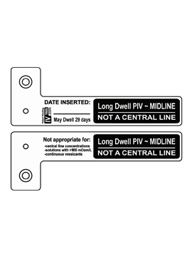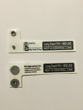 IVtags® serve as a simple and effecitive way to communicate to nursing staff. Midline/Long Term PIV tags alert and differentiate the device from a PICC or CVC. Additionaly the inserter may label the tag with the insertation date. IVtags® Communicating at the Bedside...Where Its Most Important!